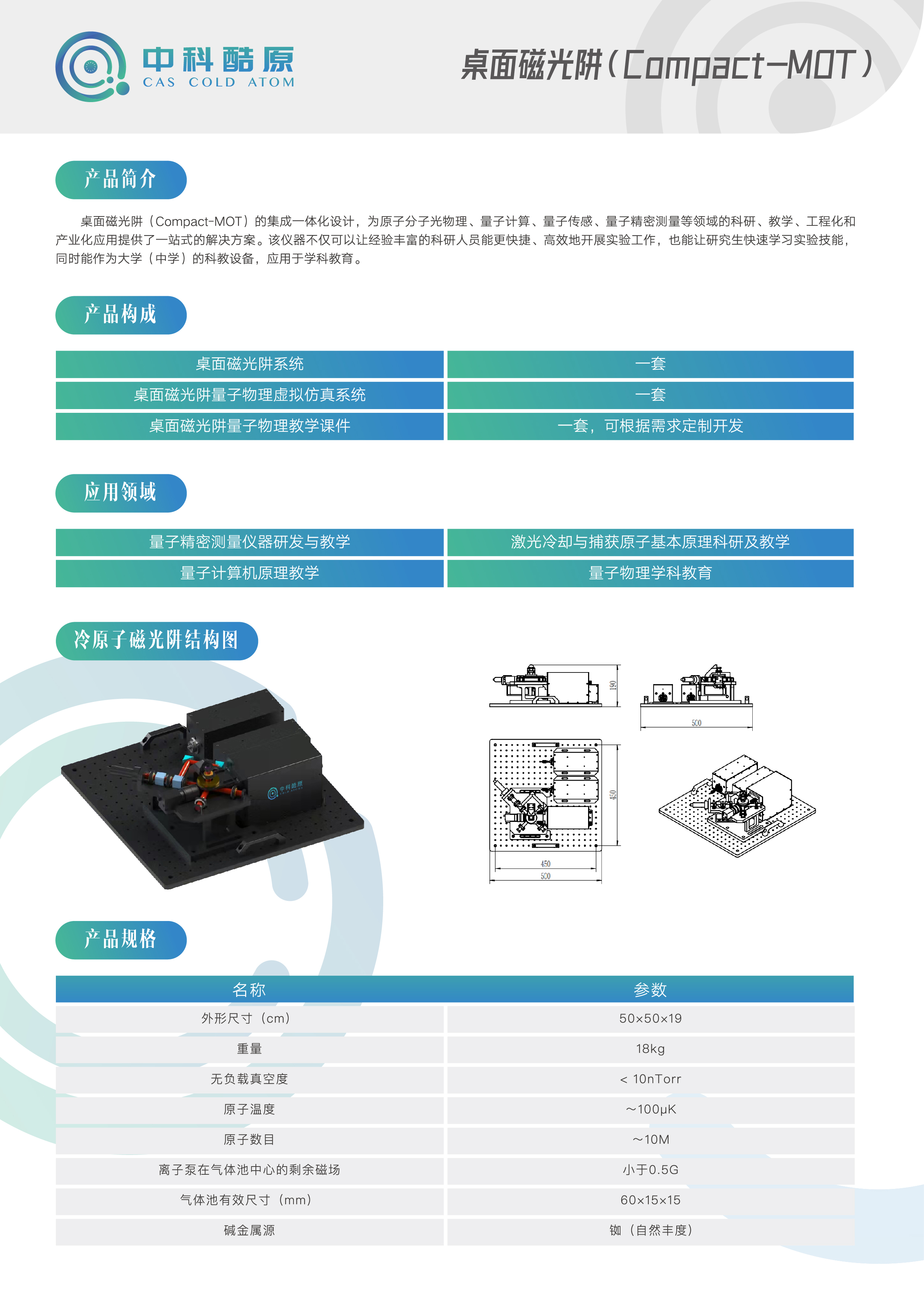 中科(kē)酷原自(zì)主研發的(de)桌面磁光(guāng)阱(Compact-MOT),集成了(le)量子(zǐ)精密光(guāng)源、超高(gāo)真空(kōng)系統、磁場(chǎng)線✔圈、控制(zhì)電(diàn)路(lù)和(hé)光(guāng)學系統,是(shì)國(guó)內(nèi)首台輕量型、桌↓面化(huà)、可(kě)便攜的(de)商用(yòng)科(kē)研和(hé)教學儀器(qì)。